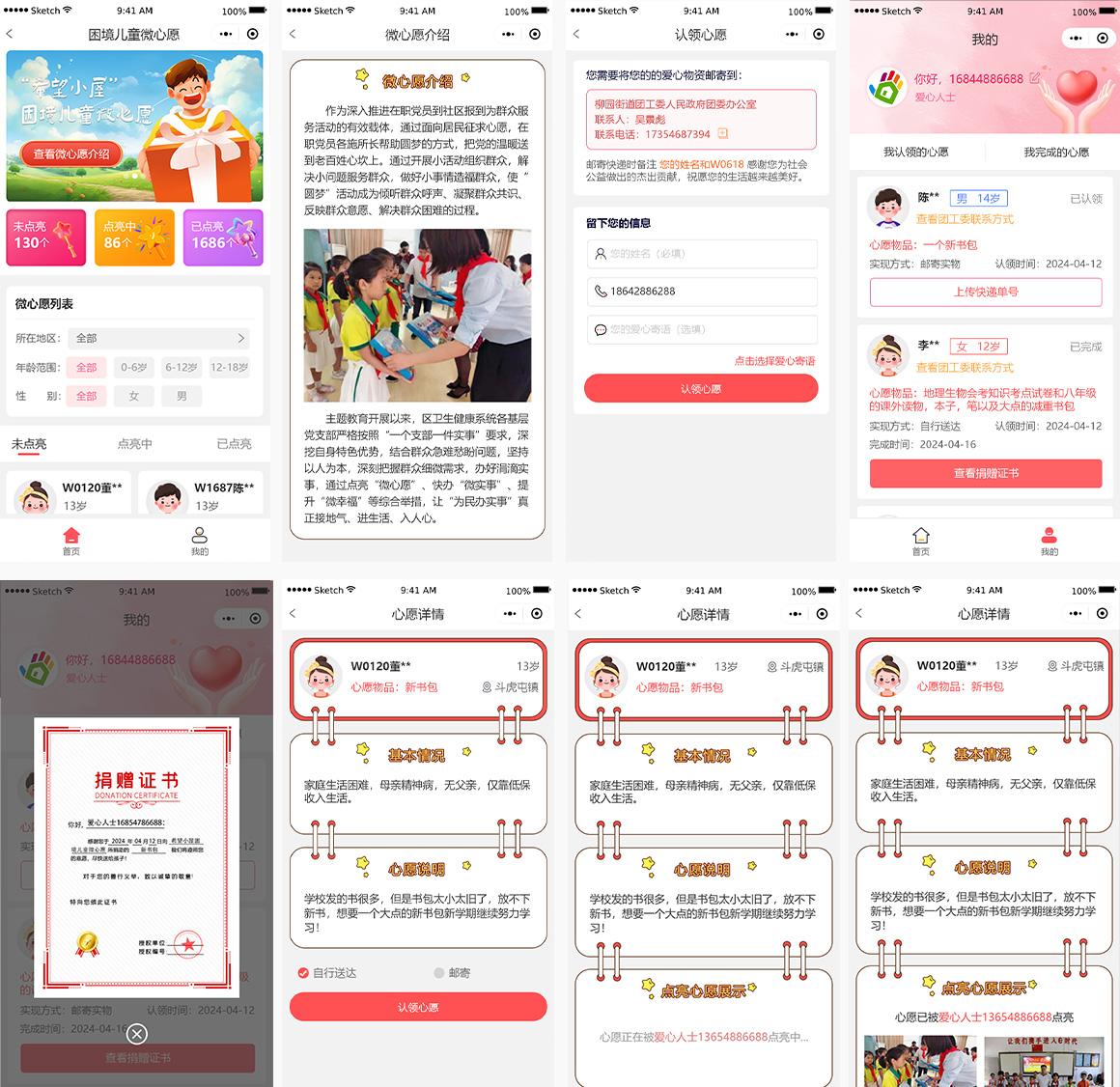 本系統(tǒng)是某市團(tuán)工委為實(shí)現(xiàn)困境兒童的心愿專(zhuān)門(mén)設(shè)計(jì)開(kāi)發(fā)的,困境孩子的心愿可在小程序端展示,愛(ài)心人士可以認(rèn)領(lǐng)孩子的心愿,可通過(guò)快遞郵寄或者自行送達(dá)的方式送到團(tuán)工委,由團(tuán)工委統(tǒng)一發(fā)放給孩子。愛(ài)心人士捐助以后,孩子的愛(ài)心被點(diǎn)亮,團(tuán)工委收到孩子的心愿物品為愛(ài)心人士頒發(fā)證書(shū)。
